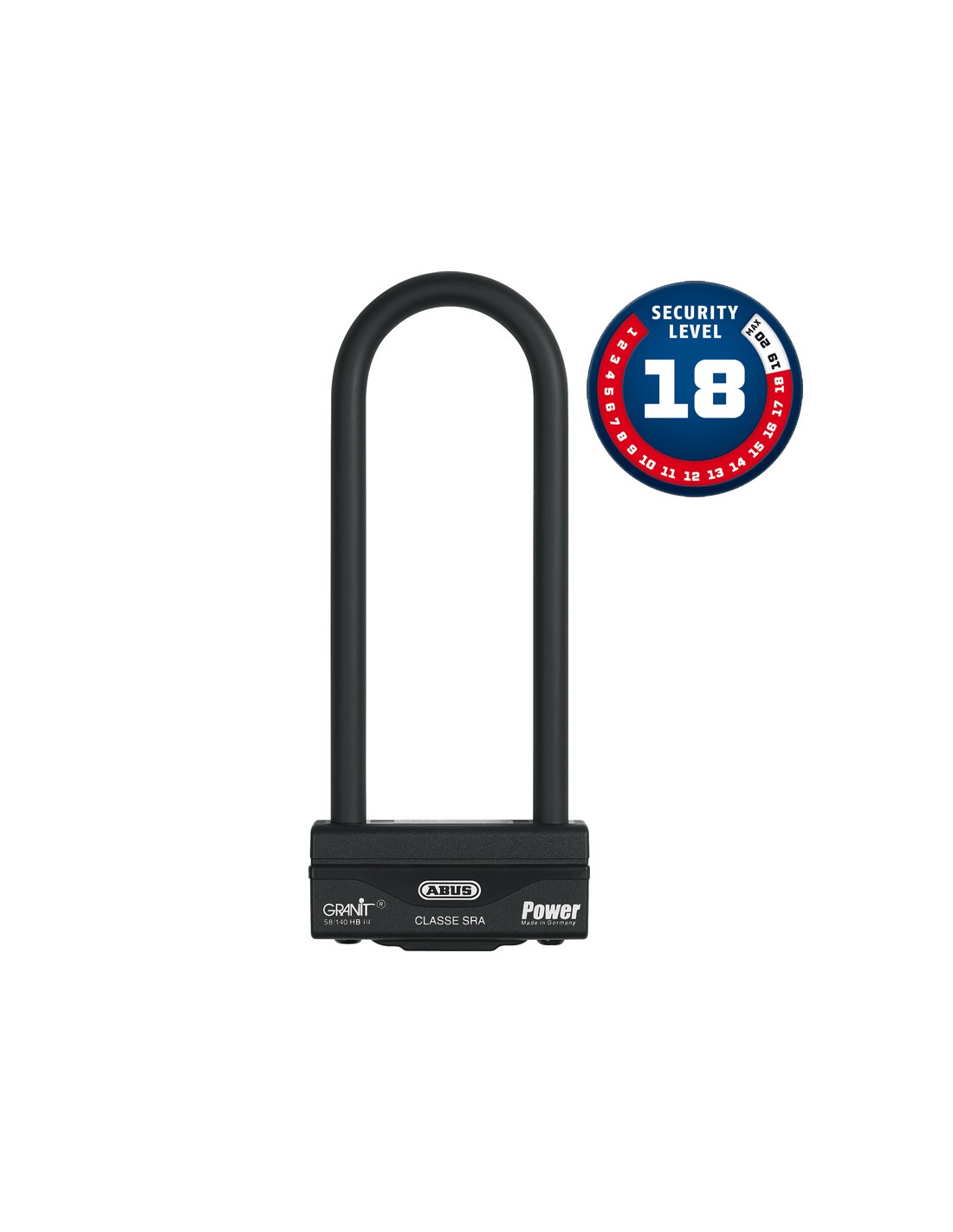 Este antirrobo de arco de 16 mm se mantiene en un respetable nivel 18 en el ABUS GLOBAL PROTECTION STANDARD®. Al cerrar el GRANIT™ Power 58, el arco se bloquea doblemente en el cuerpo del antirrobo. A continuación, el acero templado especial encaja en su contrapieza y los ladrones no tienen nada que hacer.