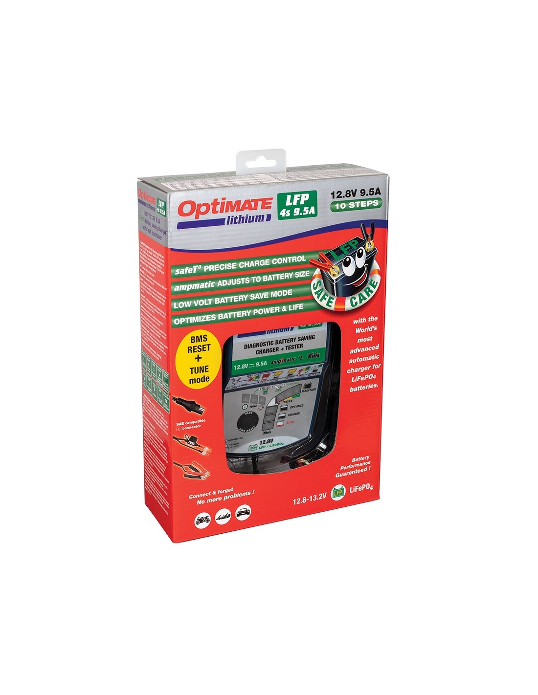 OptiMate Lithium LFP Select es la opción ideal para baterías LiFePO4/LFP de alto rendimiento de 12,8 V (4 s) y 16 V (5 s) que requieren una carga con temperatura controlada, fiable, rápida y totalmente automática. Perfecto para baterías LiFePO4/LFP de 12,8 V / 16 V de entre 2,5 y 200 Ah. Modo de espera con ahorro de energía. Protección electrónica total ante errores.
