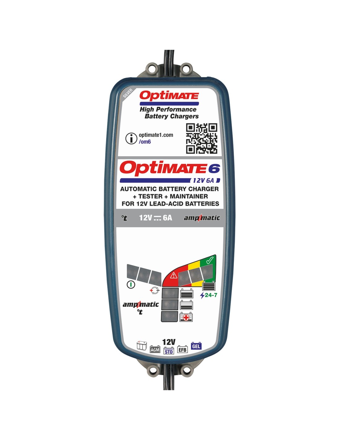 Optimate 6 Ampmatic es el cargador inteligente totalmente automático plug & play para motocicleta, coche, pick-up, barco o caravana.