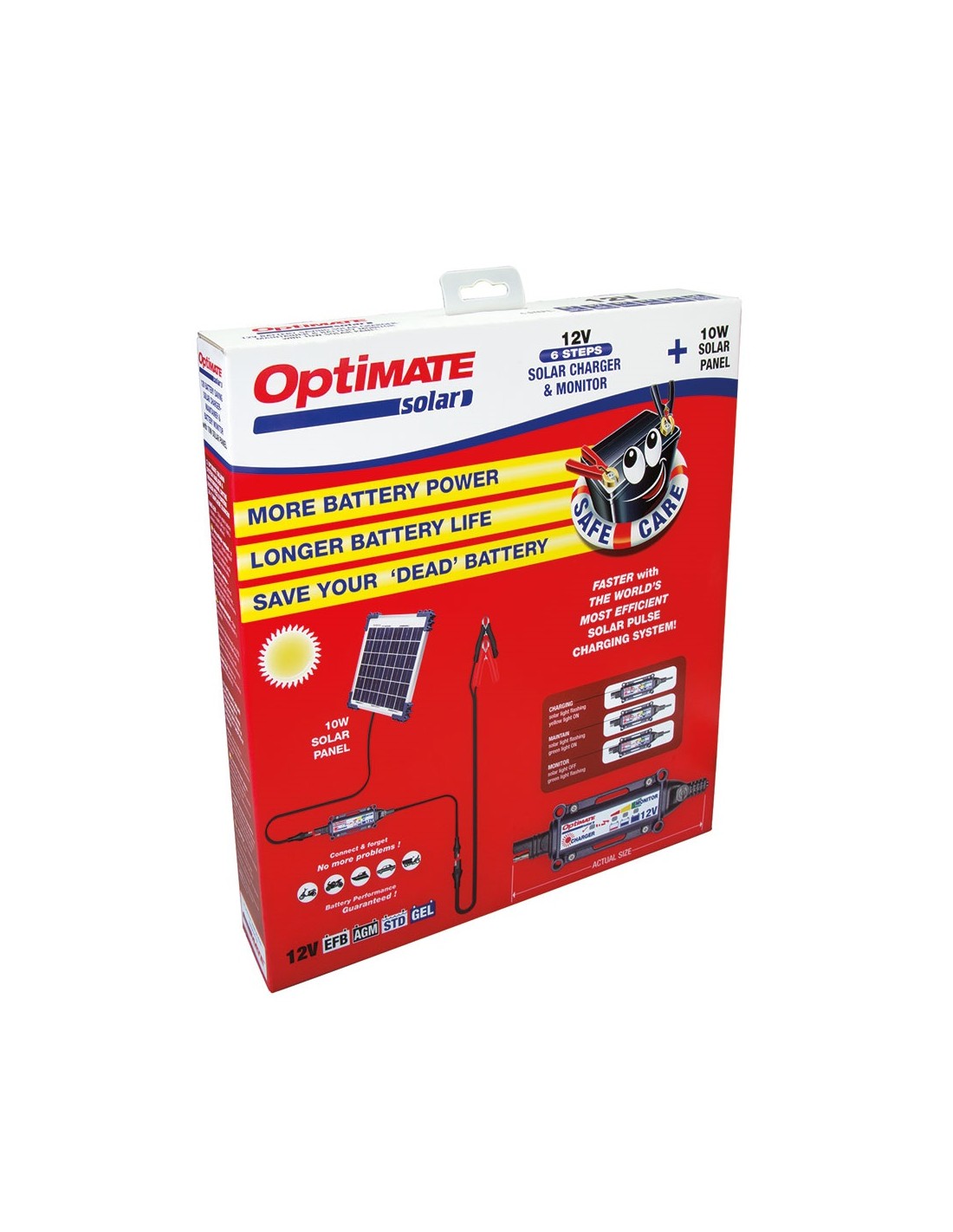 El controlador de carga inteligente completamente sellado convierte la energía solar y proporciona un máximo de 0,83A en pleno sol O una carga por impulsos si está nublado a su batería de plomo-ácido de 12V (STD, AGM, GEL) de arranque o de ciclo profundo