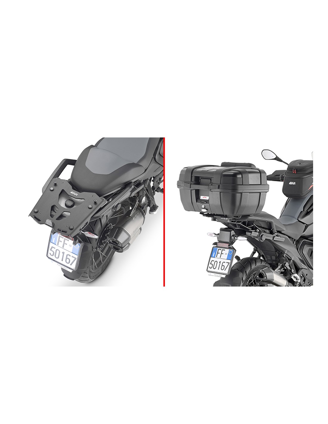 Se monta solo en combinación con el portapaquetes en aluminio para maleta original / no permite la instalación de un kit de luz stop sobre la maleta y/o dispositivo de mando a distancia para la apertura de la maleta