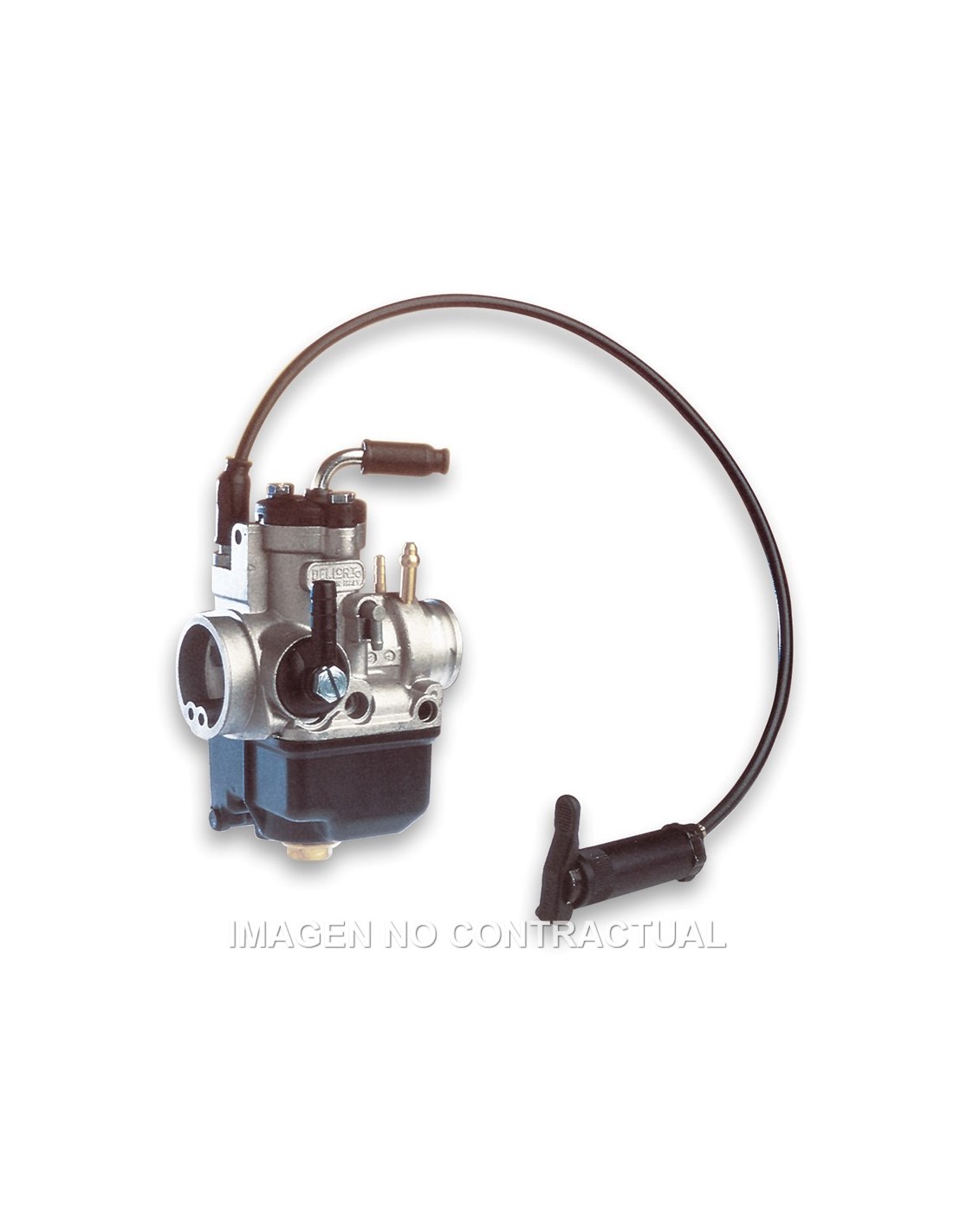 Carburador con fijación elástica (B) y tornillos de regulación a la derecha (D)