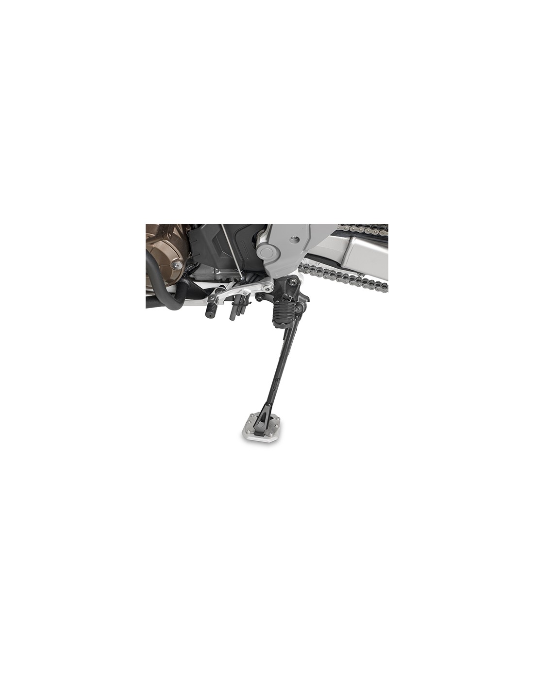 Realizado en aluminio y acero inoxidable. Este accesorio permite ampliar la superficie de apoyo del caballete lateral original.