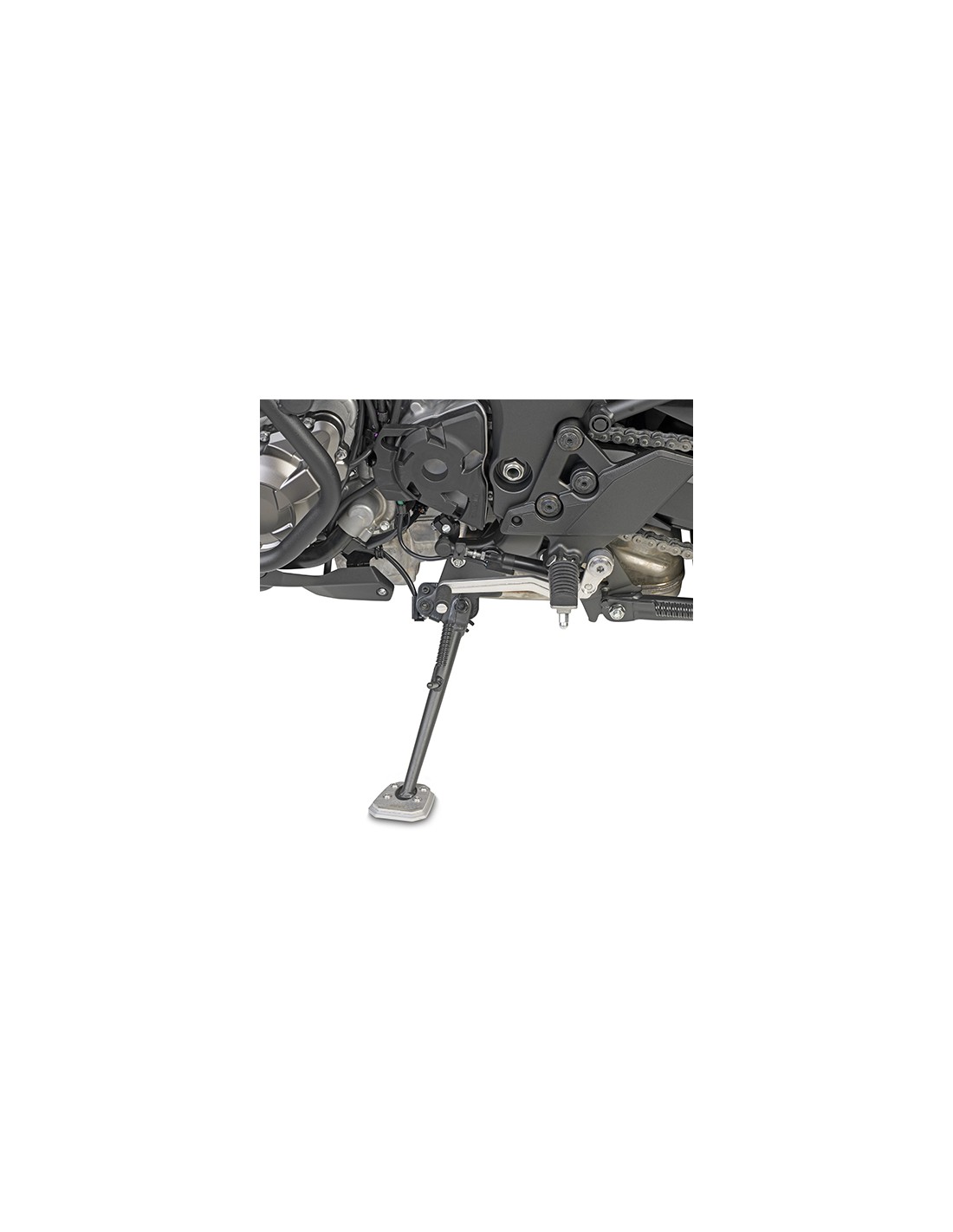 Realizado en aluminio y acero inoxidable. Este accesorio permite ampliar la superficie de apoyo del caballete lateral original.