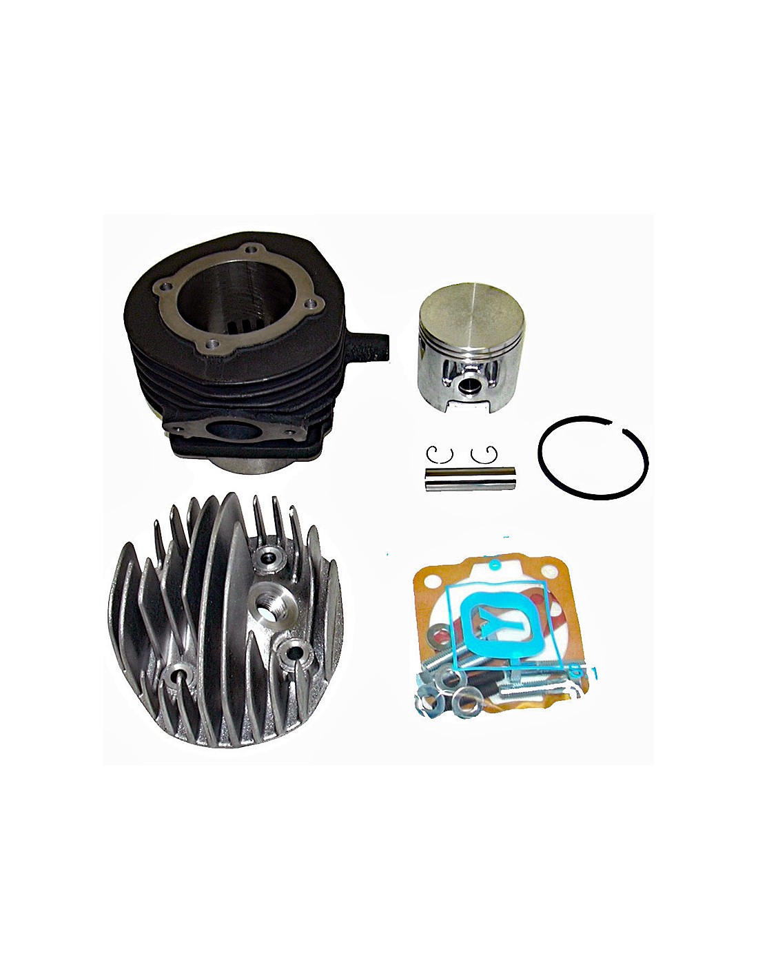 Cilindro en hierro de fundición,de 6 transfers, con culata y pistón de diámetro 55 mm con dos segmentos de acero de 1,2 mm de espesor Cilindrda: 102 cc, carrera 43 mm.